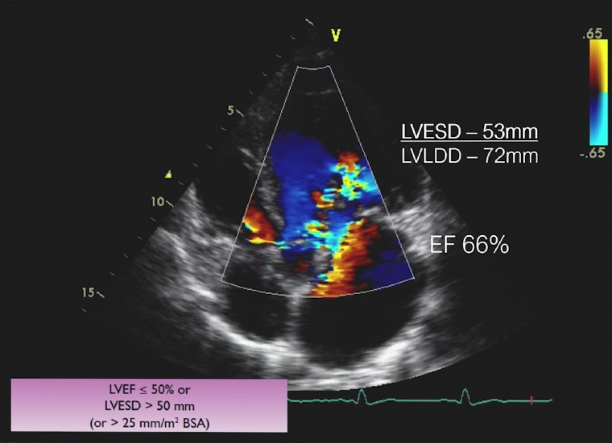 Ciężka niedomykalność aortalna na tle dwupłatkowej zastawki aortalnej.